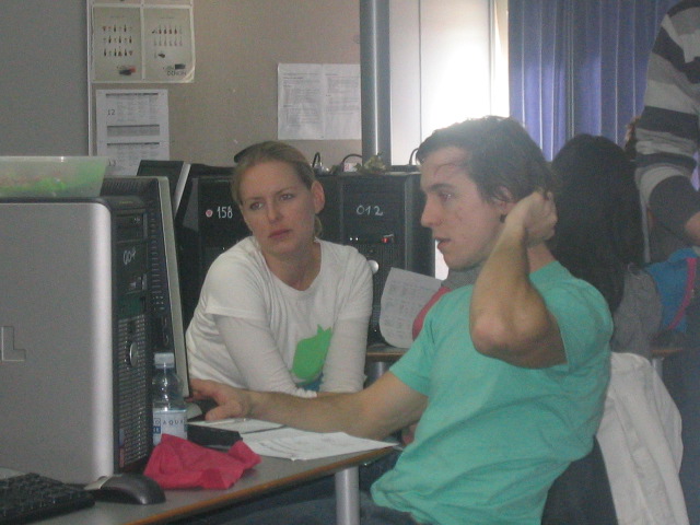Við Borgar og svo Freyr og Malene, sem er dönsk, erum saman í hóp núna. Í augnablikinu erum við að útbúa gagnagrunna. Þau eru mjög niðursokkin í að skipuleggja það sem á að færast í gagnagrunninn..ég lufsaðist með. Reyndi að muna eitt og eitt orð og segja það þegar ég hélt það ætti við, en þess á milli hugsaði ég bara um eitthvað annað. ..