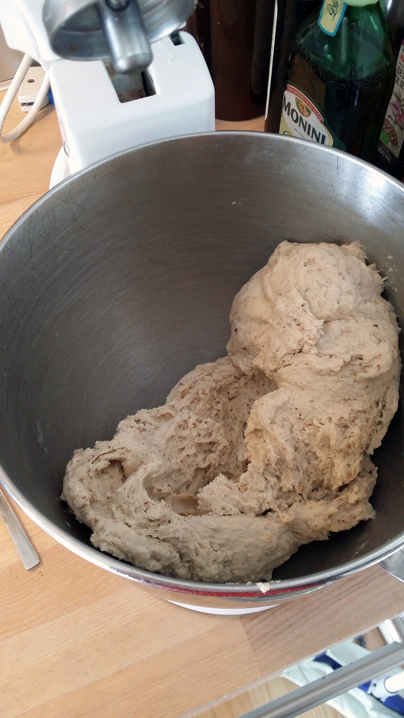 Enn og aftur kennslustund í að hnoða deig. Það er langbest að hnoða það ekki í höndunum heldur láta vélina um það og fylla svo vökvann með það miklu mjöli að deigið hreinsar hrærivélarskálina fyrir þig á meðan þú hnoðar. Hringið í Hagkaup! Ég er tilbúin að skrifa Hagkaupsbókina um brauðbakstur og hnoðun brauðdeigs.