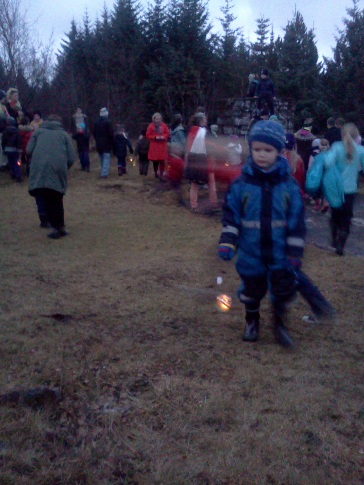 En við förum nú samt. Meðal annars í göngu uppí Öskjuhlíð með krökkunum í Barnaskóla Reykjavíkur. Það var reyndar alveg stjörnu huggulegt. Allir með lugt sem þeir gerðu sjálfir og svo var sögð ein lítil saga, sungin tvö lög og svo máttu krakkarnir fá kakó.