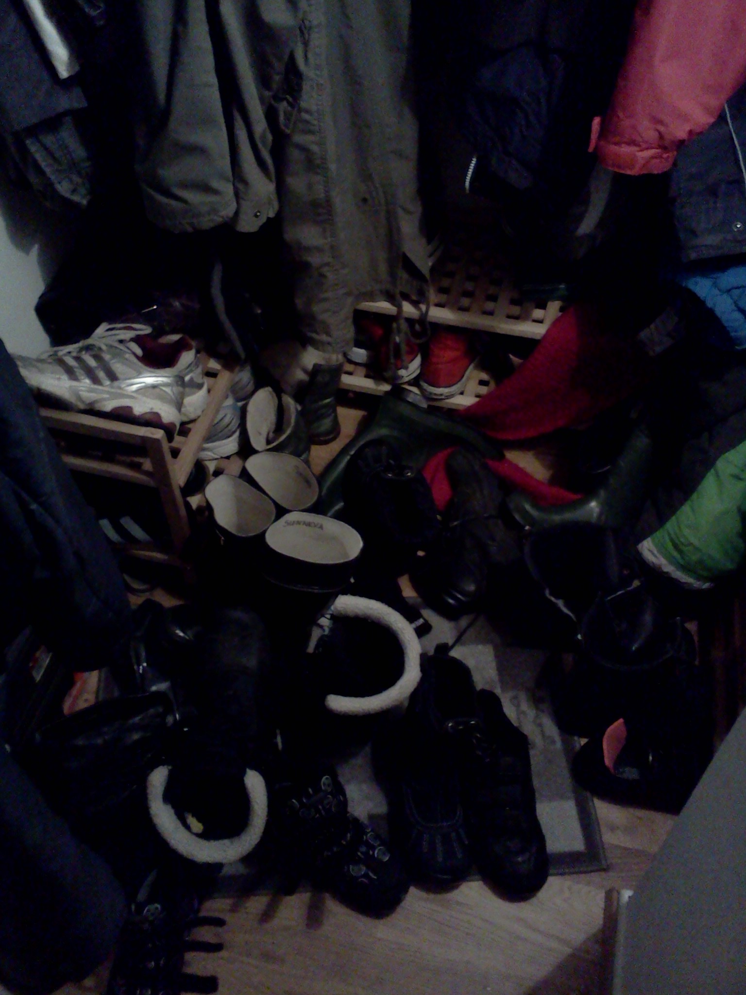 Eigum við að ræða þetta fatahengi eitthvað? Það er ekkert grín að vera með fimm manna fjölskyldu þar sem allir nota orðið skó yfir númer 30. Það eru stígvél, kuldaskór, inniskór, strigaskór, handboltaskór, innanhússkór, leikfimiskór og skór sem enginn veit hvað eru að gera þarna. Guði sé lof fyrir að ég get lokað þarna inn.