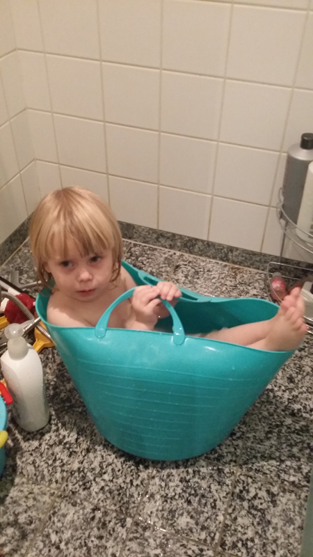 Fleiri baðuppátæki. Ég er ekki hrifin af því að láta sturtuna buna endalaust svo ég vil frekar að hún fari í bað. Auðvitað er ekkert baðkar hér og balinn orðinn of lítill. En þessi þvottakarfa er alveg að virka. Hún virkar líka til þess að dreifa vatni útum allt baðherbergið.