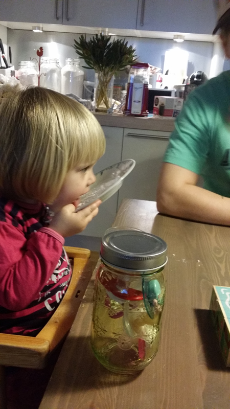 Við höfðum hefðbundið danskt jólakaffi þegar mAmma R var hér, við höfðum eplaskífur, sem eru steiktar deigbollur, alveg svipað og kleinur og þannig, sætar aðeins, og með því er haft flórsykur og sulta. Svo situr kona við kaffiborðið og dýfir í sultu og dregur uppúr flórsykri. Ef þessi desember mánuður er ekki óverkill af nammi og sætindum þá veit ég ekki hvað.