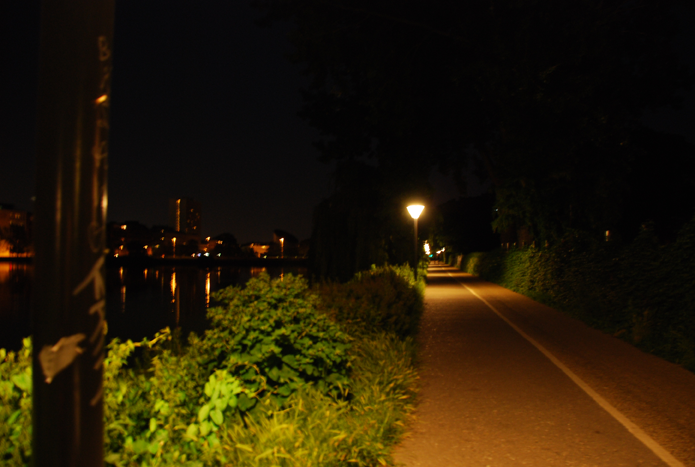 Það er hjólastígur og hlaupastígur fyrir ofan húsin sem ég skúra. Það er pissfyndið hvað það er mikið af kófsveittum hlaupagörpum þarna með andateppu. Það var enginn að hlaupa núna í kvöld enda ég á ferðinni til baka um hálf eitt. Hlaupa/hjólastígurinn er á milli húsanna og vatnsins.