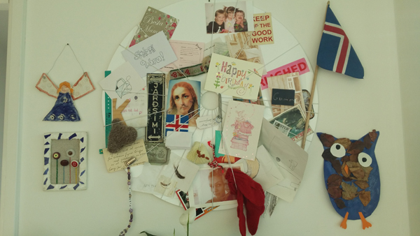 Þetta er skemmtilegasti veggur í veröldinni. Hann er inni hjá mér, er ég ekki heppin. Við fengum þennan hring í brúðkaupsgjöf. Fyrst þurfti ég að velta honum fyrir mér, skoða að framan og aftan því þetta er jú bara hringur, eða platti með teygjum úr miðjunni og útyfir. En sjáðu hvaða snilld er að safnast þarna saman. Hinar og þessar myndir af krökkunum, hárlokkar frá því að þau voru lítil, hlutir sem þau hafa gert handa okkur í skólanum, kort frá þeim sem okkur þykir vænt um, miði frá ömmu, gamalt jarðsímaskilti sem ég hélt að Eiginmaðurinn myndi skilja við mig fyrir, íslenski fánin á priki OG perlaður, tónleikaarmbönd, einhverskonar peningur, spjald með stimpli af fæti Bjútíbínu frá því daginn sem hún fæddist og fleira í þessum dúr. Í kring er hitt og þetta sem er skólaföndur líka. LOVE IT!
