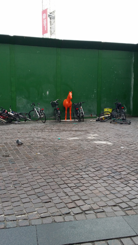 Þetta finnst mér eitt af því sem er svona gaman við þessa borg, en það er að það er eitthvað allstaðar. Þarna er hestur. Svona á meðal hjólhestanna er hestur. Á bak við græna vegginn eru metró framkvæmdir að ég held örugglega. Á flestum stöðum þar sem búið er að girða af vinnusvæði er búið að gera einhverja skemmtun á veggina, eða amk mála þá og skreyta aðeins. Þetta skiptir einhvernveginn bæði litu og svakalega miklu máli. Mér finnst kúl hvað er lagt uppúr að fegra.