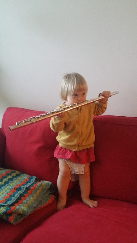 Flautuleikari uprennandi. Ég veit ekki hvað ég var að spá með að gefa mér tíma til þess að sækja símann og smella af mynd meðan hún hélt á sjötta af því sem mér stendur kærast. Hún hefði mjög auðveldlega getað farið í grallarabúninginn og grýtt henni í gólfið. Eins og hún gerði við símann minn hér ekki fyrir svo löngu.
