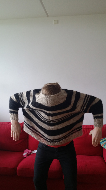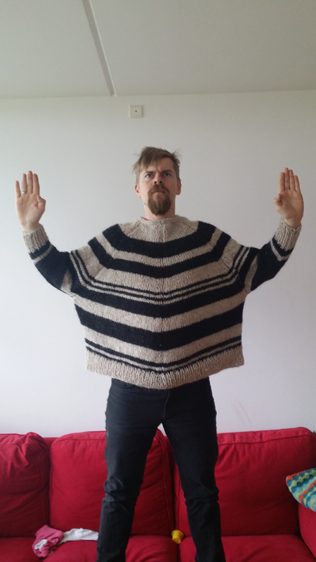 Ok, svo, eins og þeir sem fylgjast með því hvað ég bardfúsa á Fjárhúss blogginu þá var ég að þýða prjóna uppskrift sem heitir Erfinginn. Prjónaði auðvitað blessað plaggið og hér er þá Eiginmaðurinn í því. Hvílík stelling…