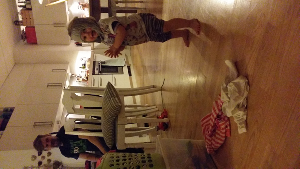 Og hvað er þá hér að gerast? Jú, hér er ég að betrekkja eldhússtólaseturnar. Efnið á þeim var orðið frekknótt af eldhússskít eftir okkur, eða aðallega barnaskammirnar. Auðvitað verð ég að geta þrifið þetta almennilega svo ég fór og keypti vaxdúk. Klippti niður og heftaði í köku.