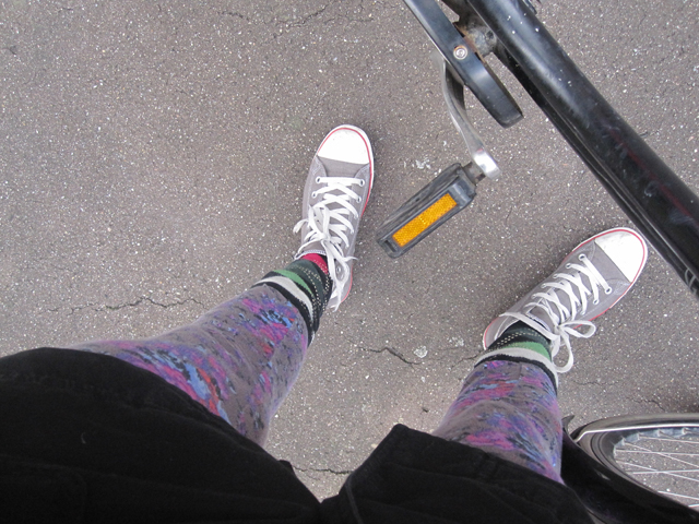 Ég og hjólið mitt. Sokkarnir yfir og skórnir sem einhver tók í misgripum í Yoga Shala í fyrra, skildu samt eftir alveg eins skó, en þeir voru bara aðeins of litlir. Merkilegast við þessa sögu er að þetta er í annaðskiptið á ekki svo löngum tíma að mínir skór eru teknir og aðrir minni skildir eftir.