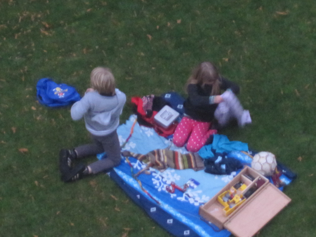 Krakkarnir í lautarferð í garðinum á Englandsvej. Þarna má sjá eitthvað nesti, fótbolta, legókubba, peningakassa og aukaföt. Aldrei of vel búin.
