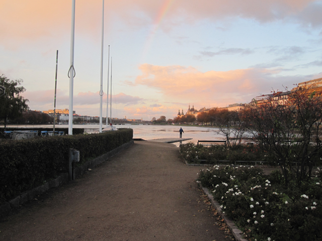 Þarna er maður að veiða við endann á þessari míní bryggju. Ég býst við að ég hafi verið að hjóla frá vinnu og held að þetta sé einhverstaðar í kringum Norrebro. Held ég. Svo falleg birta.