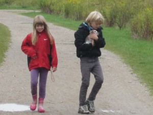 Og þau bæði einhvernveginn. Svo ég fæ þá snilldar hugmynd að ætla að taka svona mynd af þeim systkinum saman við útidyrahurðina… geri smá tilraunir á Örverpinu fyrst, á meðan þau hin græja sig úr útifötunum.