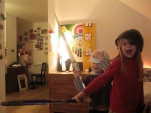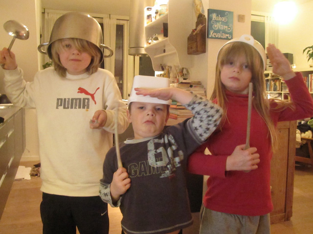 stríðsleikur. Þau voru í alvöru bardaga! ÁRÁÁÁÁÁÁS! Það er gildir sama reglan og þegar þau voru skríðandi flokkur bleiurassgata, búsáhöldin eru bestu leikföngin.