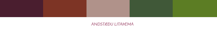 Á litadæmunum hér að ofan er aðalliturinn alltaf sá sami, þessi dökkvínrauði alveg til vinstri. Hinir litirnir koma fram eftir því úr hvaða flokki þeir eru valdir.