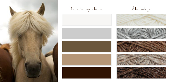 Þegar ég var síðan búin að ákveða hvaða liti ég vildi fá úr myndinni paraði ég Álafosslopann saman við, þetta eru hvítur, ljósgrár, mórauður, ljósmórauður og dökk mórauður.