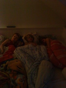 Þegar ég fór í sveitina í Vig, að yoga, hugleiða og kyrrja, höfðu þau það veldig (verulega) godt (gott) hjemme (heima). Þessa mynd fékk ég senda í símann minn á laugardagskveldinu, allir steinrotaðir í rúmi voru. Ég spurði Bóndann hvort hann hefði ekki notað tækifærið (sem ég hefði pottþétt gert) … (oooooo, ég er að hlusta á Vigdísi Finnboga í útvarpinu og hún segist vera A-manneskja, ég er ekki forseta efni sem sagt, urg) .. bíííííbbb, ég spurði Bóndann sem sagt hvort hann hefði ekki girpið gæsina þegar hún gafst og sofið í rúminu hennar Sprengju sem er eina almennilega rúmið hér á heimlinu. Nei, var svarið, hann svaf með þeim öllum í bólinu sem er ekki nema bara fyrir tvo fullorðna.