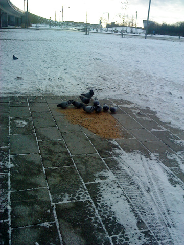 Og svo vill ég hneykslast ennþá meira, meira heldur en á plaggatinu sem sýnir opið gat afturendans og orm að koma hressan og glaðan og ánægðan með sína tilveru út úr því, og spurningin er : HVERJUM DATT Í HUG AÐ FÓÐRA DÚFUR VIÐ METRÓSTÖÐINA? ..í alvöru? Hélt viðkomandi að dúfur hér í Kaupmannahöfn væru í hættu því þær fengju ekkert að borða? Ég er viss um að það hefur verið einhver rugludallur. Sönnunargögnin að það var rugludallur eru að það voru líka yfirgefnir inniskór þarna.