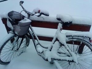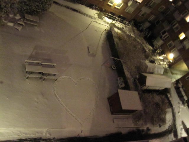 Og því ég var að vanda mig svo svakalega við að hjóla þá hafði ég bara ekki tekið eftir því að það var reyndar alveg dásamlegt veður úti. Alveg logn og ekki kuldi svo ég fann fyrir því. Og svo góð lykt. Þessvegna meitlaði ég með fótunum hjarta í snjóinn. Því ég elska.