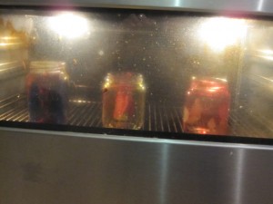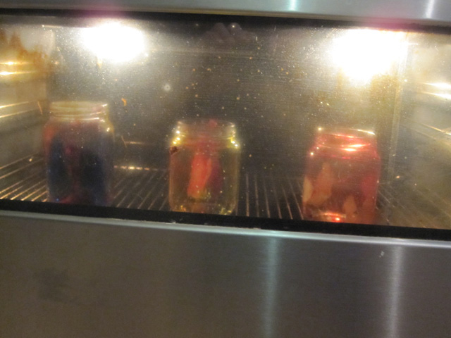..og þá er einmitt viðeigandi og alls ekki óeðlilegt að baka glerkrukkur. Þær voru málaðar af natni og svo varð að festa litinn :)