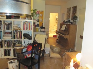 Talandi um eirðarleysi. Hér hafði ég verið að einhverju öðru, kannski sat ég við tölvuna og var ekkert að fylgjast með hvað var að gerat á öðrum vígstöðvum þessa Félagsbús. Og endaði það svona. Innkaupin allstaðar, fötin allstaðar og búið að binda band á milli allra hurðanna innst í íbúðinni.. svo tættist ég uppúr sæti mínu og ætlaði að dúndrast í að taka til, en þá þurfti ég einmitt að stunda limbó til að geta grýtt óhreina fjallinu inná þvottabað. Sem betur fer er þetta komið í lag núna.
