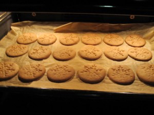 Svo í fyrra, þegar ég hafði ekki andann í að baka, var mér gefið svo skemmtilegt kökuáprentunartæki. En það sker út kökur og stimplar á þær snjókorn, jólatré og snjókarl! NÆS.