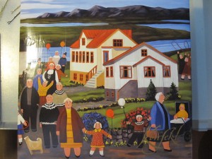 Og eymingja póstmennirnir hafa verið að bögglast upp stigann með allar jólagjafirnar. Haha, orðið „að bögglast“ hlýtur að vera komið af því að fólk býr hátt uppi án lyftu og póstmenn þurfa upp með jólaböggla til útlendinga eins og ég er í þessu landi. Allavega var þessi konfektkassi (sem er búinn, bara svo þið farið ekki að ryðjast hingað í heimsókn og heimta nammi) í einum kassanna og það fyrsta sem ég hugsaði var Hróarsholt þegar ég sá hann. Ég hef reyndar bara einusinn, svo ég man, komið að Hróarsholti og ég man ekki hvort stærri bærinn við hliðina á því var ennþá þarna eða hvað og eiginlega get ég ekki sagt að ég muni efitr því en þetta minnti mig samt á það. Þetta er málverk eftir hana konu sem heitir Gunnella.