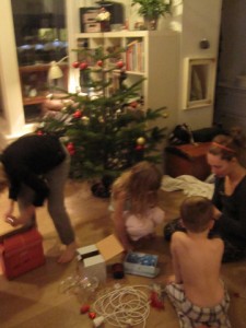 Nú eru fjórðu jólin sem við höldum hér í Danmörku. Það var ekkert ætlunin að gera það þetta árið en svo fór sem fór. Við erum þessvegna búin að smitast svolítið af dananum sem hendir upp jólatré bara í byrjun des og hefur það skreytt alveg þangað til.. bíddu.. bíddu… 26.des…haha. Fyndið þegar við sem íslendingar fyrstu jólin settum stolt upp tré 23.des eins og okkar er von og vísa, en lásum svo skilaboð frá húsverðinum sem vildi fá trén út í rusl síðasta lagi 26.des. Við eru þessvegna búin að skreyta tréð og það er fallegt. Bóndinn vill bæta við bláu, en mér finnst það fullkomið. Hvað verður ofaná??.. Þú mátt giska.