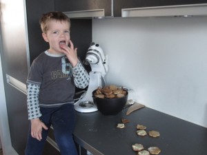 Og því ég var rekin á fætur, reyndar af sjálfri mér, svona snemma þá erum við búin að gera ýmislegt. Tildæmis að setja blessað smjörkremið á mömmukökurnar gómsætu. Ég smurði kreminu á og Örverpið lokaði þeim og setti fyrst í kökudunk og svo í skál.