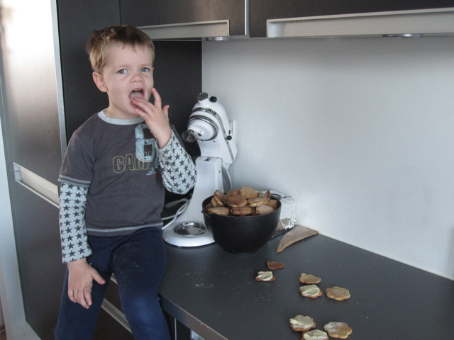 Byrjaði síðan að vera rosalega lengi að klína efra kexinu á neðra kexið. Og svo leit ég upp og þá var hann að sleikja smjörkremið, með sko bestu lyst sem held ég er til í heiminum. NAMM.