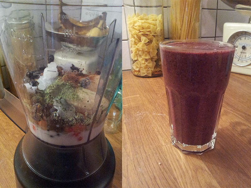 Af einhverjum ástæðum hef ég ekki áhuga á að nota kúa-mjólkurvörur í sjeika, hef þessvegna aldrei smakkað skyrbúst, mér finnst eiginlega að skyr sé tilbúið til neyslu, þarf ekki að bæta neinu við það þannig… þannig ég nota möndlumjólk, úr búð eða sem ég geri sjálf. Það er alveg pípandi lítið mál að búa til möndlumjólk, bara 2 dl möndlur og 8 dl vatn í 8-12 tíma, trylla þetta í blandara og sigta í gegnum viskastykki eða taubleiu. Já, þú getur aldeilis líka keypt þér spírupoka og allskonar í kringum möndlumjólkur gerð, ég nenni bara að gera þetta á einfalda mátann með því sem hendi er næst.