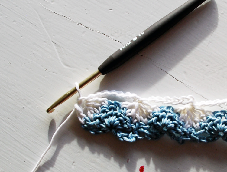 3. Umferð: 4 ll, sleppa fyrsta st, * Sth6 yfir næstu 6 st (sleppa fp í miðju), 7 ll, sleppa ll *. Endurtaka frá * – *. Enda með að gera Sth6, 3 ll, fp í efstu ll, snúa.
