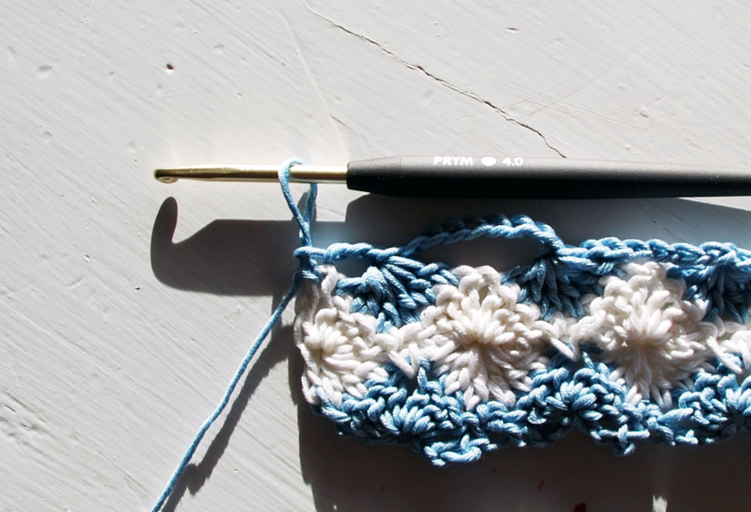 Í stykkið notaði ég nál nr. 4 og Mandarin Classic bómull. Ég hef gert teppi með stjörnuhekli og þar notaði ég líka nál nr. 4 og svo kambgarn.