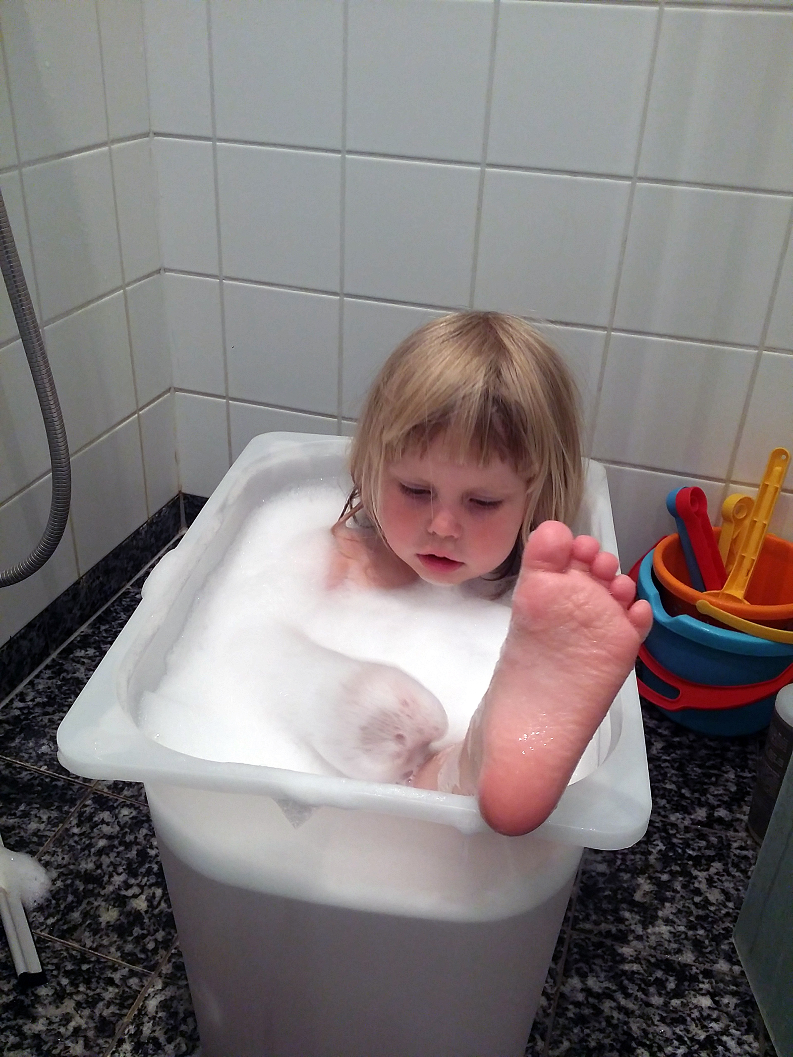 Einhverntíma varð mér á, og já, ég segi varð mér á að bjóða henni þá að koma í bað í kubbakassanum. Hann hefur verið uppspretta mikillar sápukúlu-kátínu síðan þá og kubbarnir bara á gólfinu.