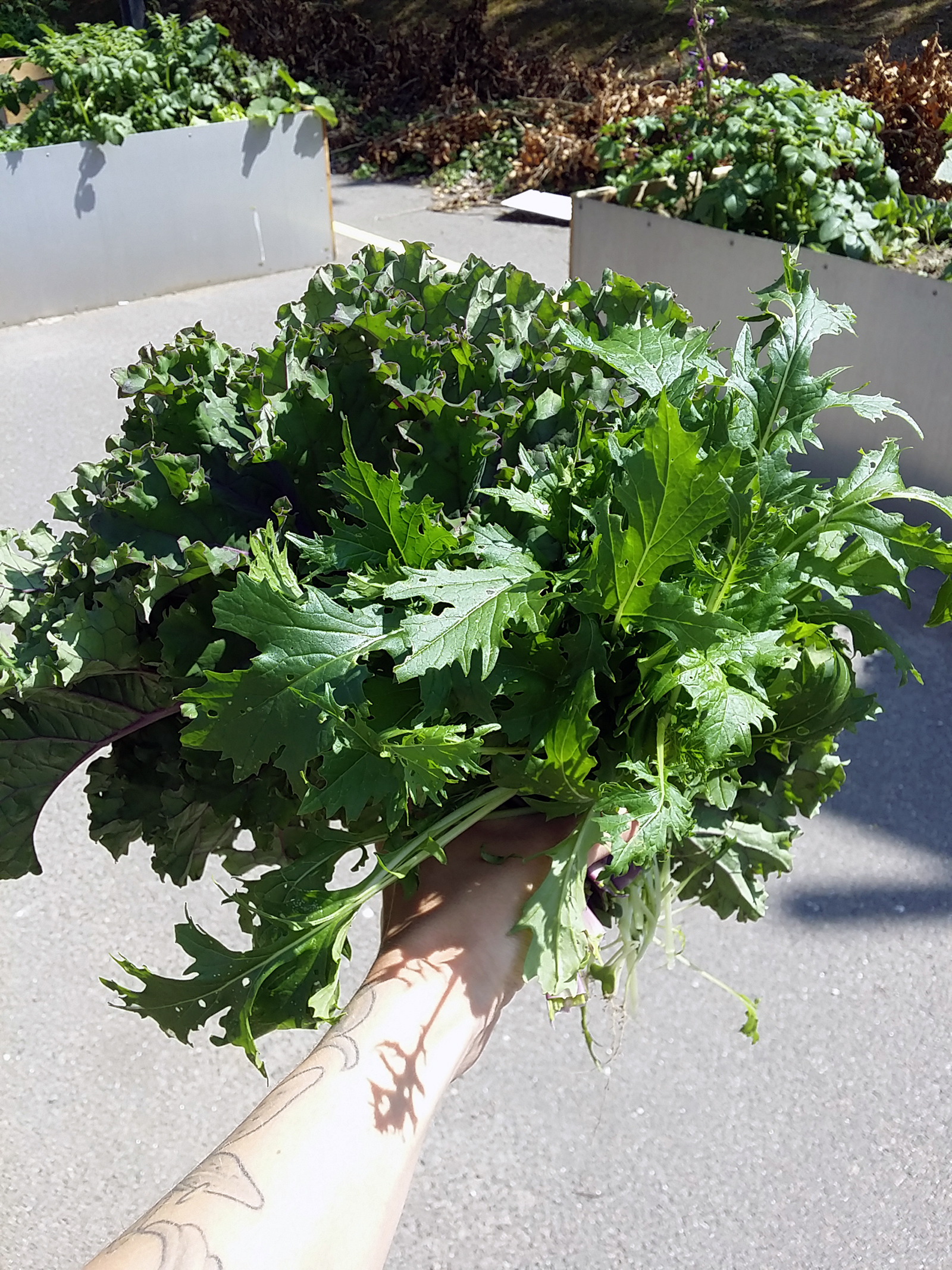 Þetta er uppskera úr Bella-garði. Þokkalega mikið af grænkáli og mísúna salati.