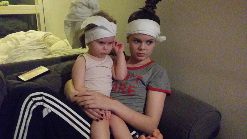 Tvær eins. Eins og stundum, þá kom upp lús hér á heimilinu. Við erum orðin svo vön og svo mikið prófessjónal í meðhöndlun á lús að ég hef sjálf hannað þessi súperfínu pappírs-svitabönd, eða náttúrulega ekki svitabönd heldur pappírs-lúsameðalsbönd. Þessvegna eru þær með pappír á hárinu.