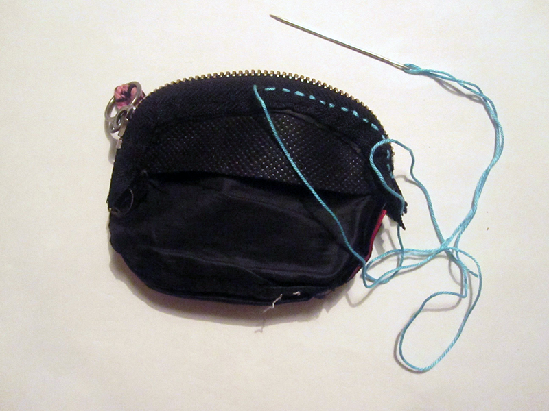 Þá saumaði ég lítil spor, með litlu millibili hringinn í kringum rennilásinn.