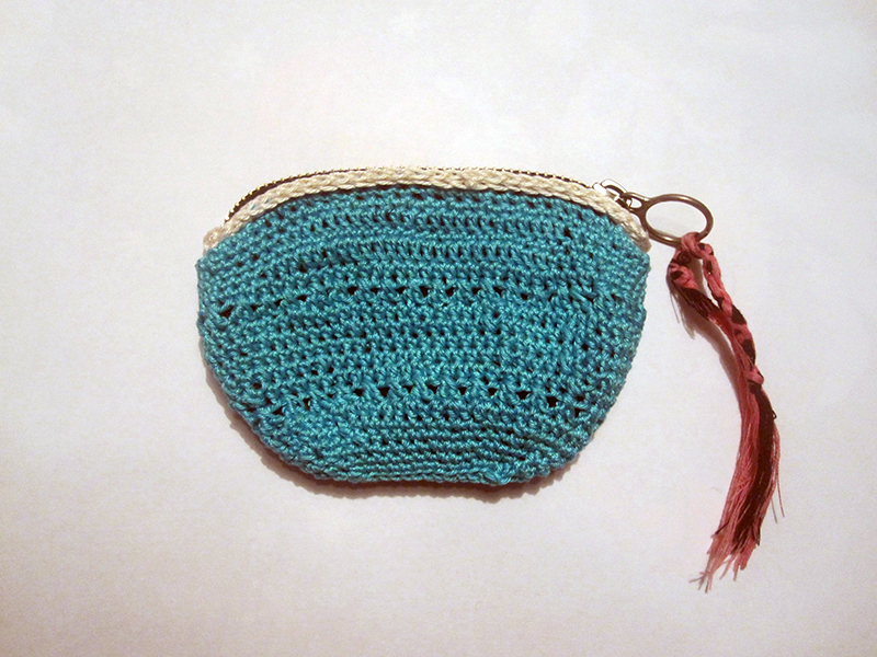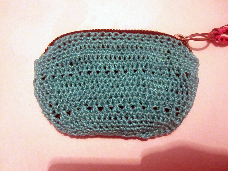 Þá endaði þetta sirka svona. Mér fannst ekki fallegur kanturinn við rennilásinn svo ég heklaði annan ofaná í öðrum lit. Bleika bandið þarna er að mig minnir vinaband sem eitthvert barnanna gerði handa mér. Það var auðvitað alltof lítið á mig og ég festi það einhverntíma við veskið. Tími ekki að taka það af :)