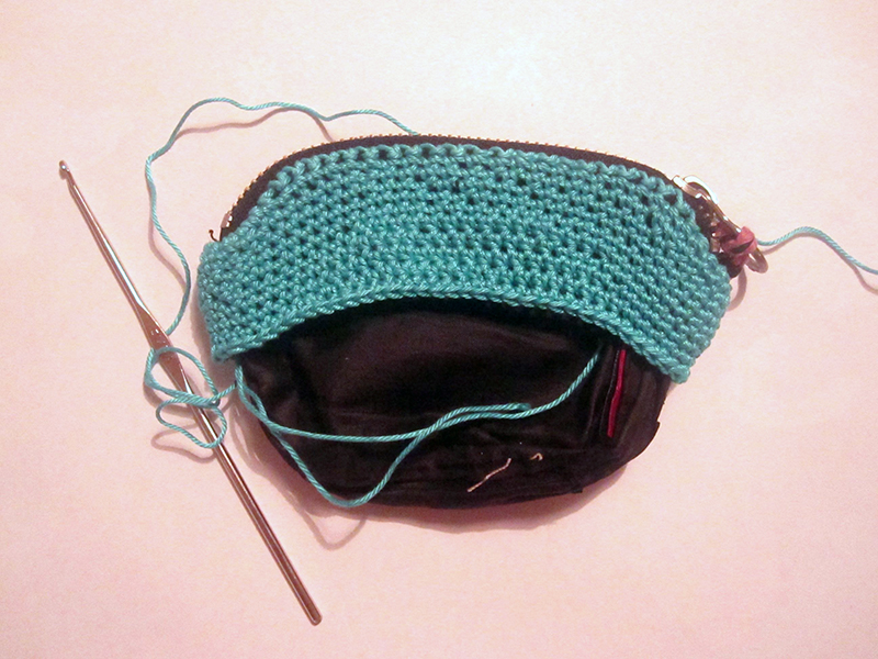 Ég hélt upphaflega að ég væri að fara að taka bara allt veskið af rennilásnum og búa til nýtt við lásinn. Þarf varla að taka fram að ég heklaði nýja andlitið á veskið. Kom í ljós, sem ég hafði ekki áttað mig á, þegar ég var búin að spretta ysta laginu af að innan í veskinu var alveg stráheilt fóður áfast rennilásnum.